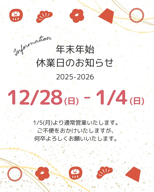 休業期間中はご不便をおかけしますが、新年明けにはまた元気に営業いたしますので、ご家族でのお出かけ前や帰省後など、お困りごとはお気軽にどうぞ。